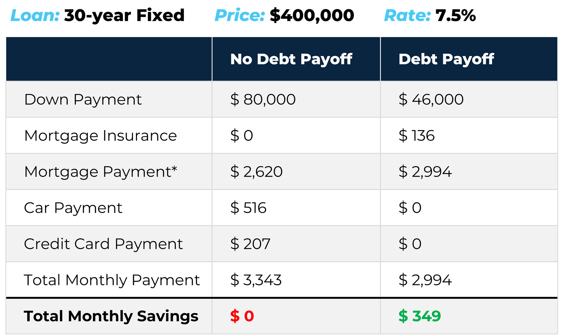 You also have a car loan and credit card debt. The total balance on these debts is $33,699 with a total monthly payment of $723 (using the average amounts above). What would the impact be if you used some of your down payment to completely eliminate these other debts?
