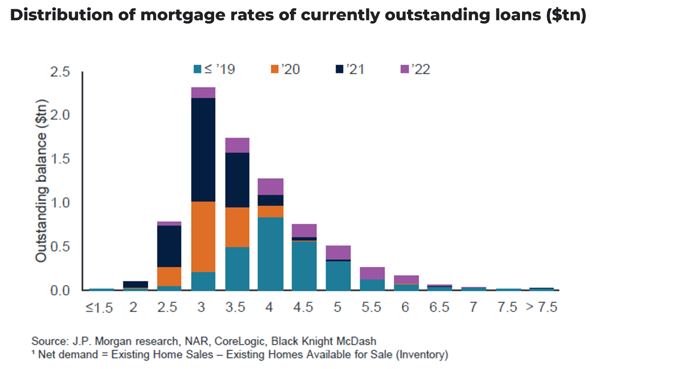 Existing homeowners aren’t moving because their mortgage rates are so low. But it’s not only that they’re so low, it’s also the cost of replacement, with prevailing market rates now edging closer to 8%.