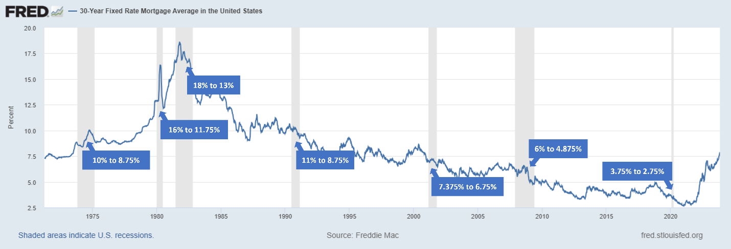 In all instances, mortgage rates went down during and immediately following the recession. And what will happen when rates come down? We agree with what real estate mogul Barbara Corcoran recently said: