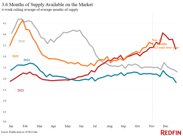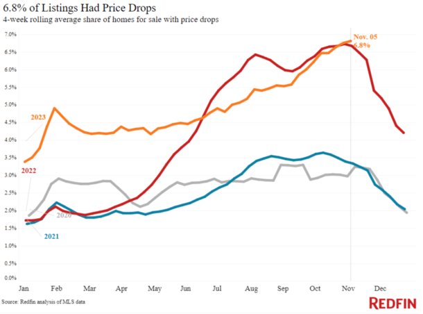 Redfin recently reported that some “glimmers of hope” are emerging for prospective home buyers. The first one being that new listings increased 1.5% from a year ago during the four weeks ending November 5th. This was just the second increase since July 2022, which underlines the continued short supply in the housing market. Redfin noted that this increase is partly because new listings were falling during this period last year.At the same time, active listings are at their highest level since the beginning of 2023, and months of supply ticked up 0.2 points to 3.6 months. Inventory remains constrained nationally, with 4 to 5 months typically signifying healthy supply. But it is rising, which appears to be leading to price reductions. The share of listed homes with a price drop increased to 6.8%, a new record high.