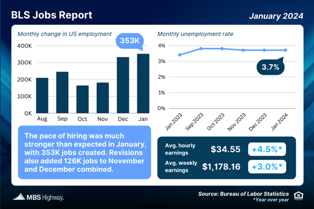 In their analysis of the most recent labor data from The Bureau of Labor Statistics (BLS), MBS Highway notes that January's jobs report might not be the blockbuster that it appears to be on the surface.The BLS reported that there were 353,000 jobs created in January, which was nearly double expectations. Revisions to November and December also added 126,000 jobs in those months combined.