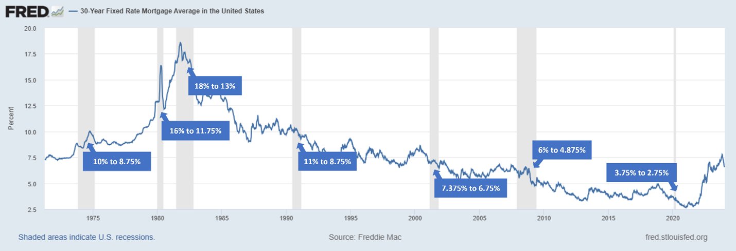 Looking back to 1970, we can see a pattern of lower mortgage rates during recessions. According to
